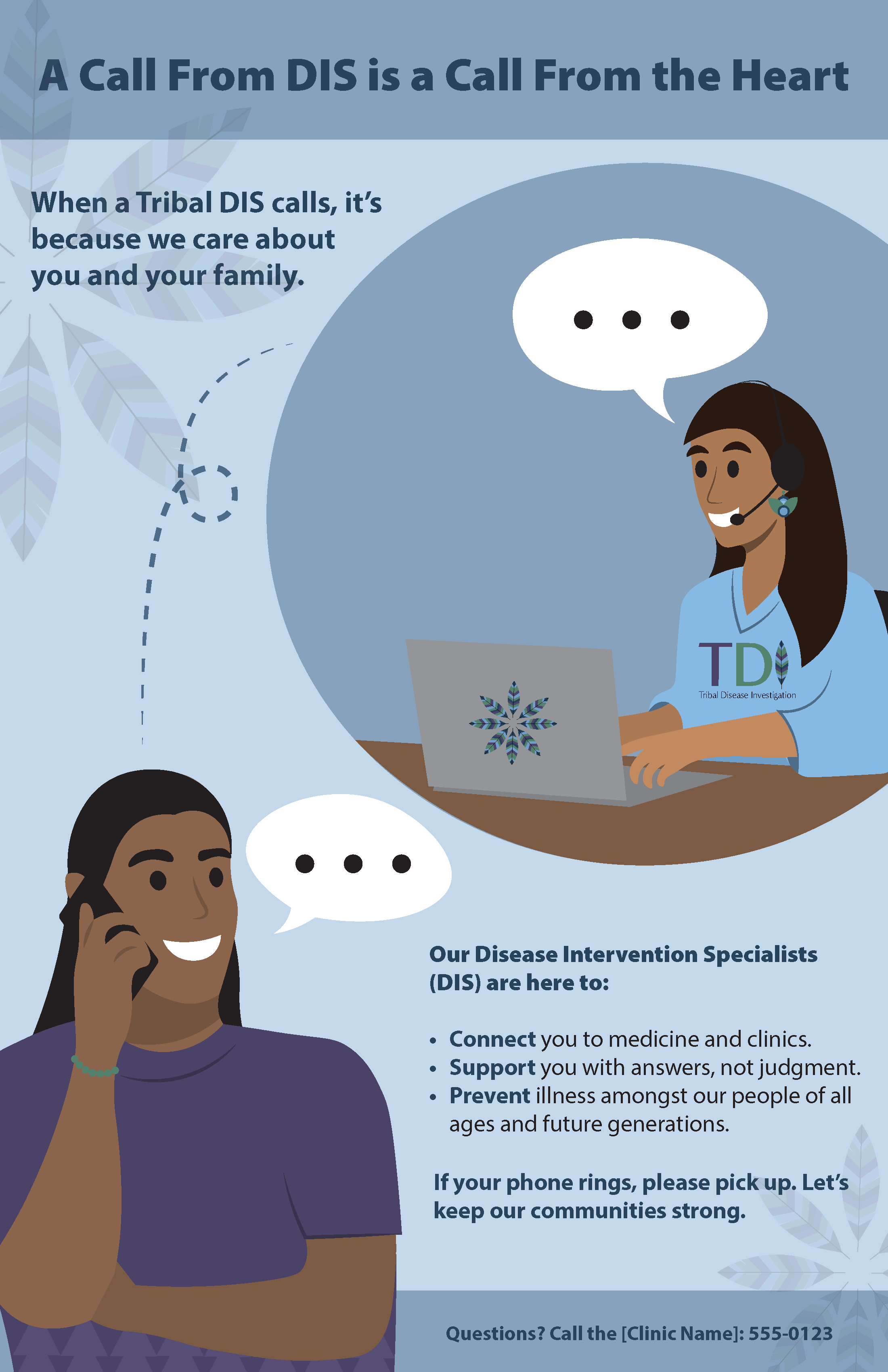 Posters designed for Tribal clinics and community spaces, introducing TDI and encouraging community members to answer the phone when a TDI calls