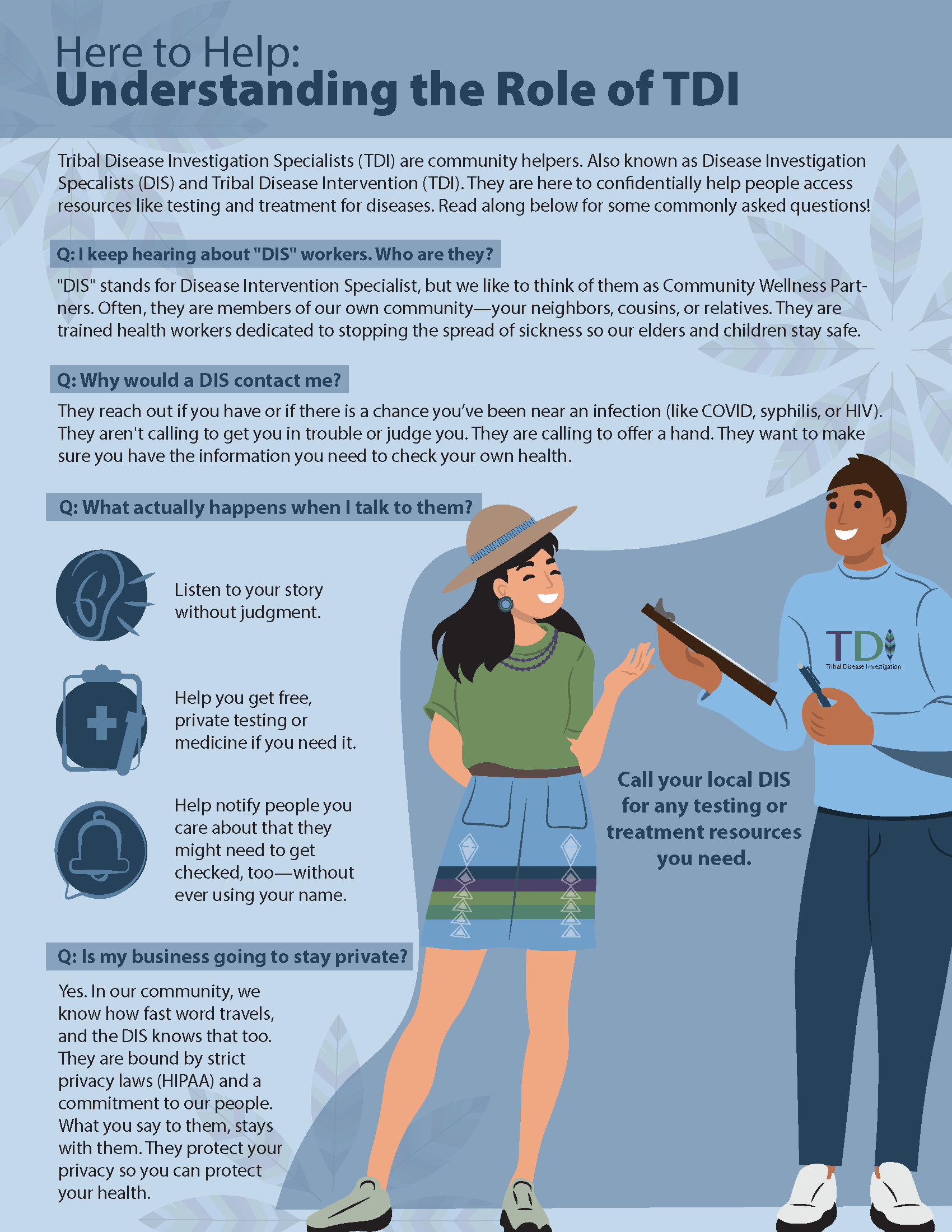 Tribal Disease Investigation/Intervention (TDI) staff support community members in accessing STI, HIV, and hepatitis testing, treatment, and prevention services. Their work is grounded in care—checking in on relatives, protecting community health, and helping people stay connected to care. Often, TDI serve as a bridge between clinics and the community, helping make health services feel more approachable and familiar.